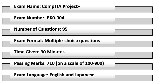 Here, we are discussing the basic details regarding the CompTIA Project+ (PK0-004) exam. The exam will have 95 questions. Where, the CompTIA Project+ (PK0-004) exam questions will come in the format of multiple-choice, (single and multiple responses), and drag and drop questions. Also, they provide 90 minutes for a candidate to complete the exam. The exam is available in the two languages i.e. English and Japanese, the candidate has to score 710 (on a scale of 100-900). The candidate has to prepare their account and register themselves for appearing in the examination. Lastly, the CompTIA Project+ (PK0-004) exam cost is $338 USD.