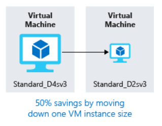 Recall from our previous discussion that Azure Cost Management and Azure Advisor might recommend right-sizing or shutting down VMs. Right-sizing a virtual machine is the process of resizing it to a proper size. Let’s imagine you have a server running as a domain controller that is sized as a Standard_D4sv3, but your VM is sitting at 90% idle the vast majority of the time. By resizing this VM to a Standard_D2sv3, you reduce your compute cost by 50%. Costs are linear and double for each size larger in the same series. In this case, you might even benefit from changing the instance series to go to a less expensive VM series. The following illustration shows a 50% savings achieved by moving one size down within the same series.