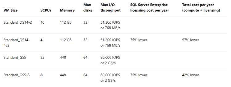 Many customers have high requirements for memory, storage, or I/O bandwidth but low CPU core counts. Based on this popular request, Microsoft has made available the most popular VM sizes (DS, ES, GS, and MS) in new sizes that constrain the vCPU count to one half or one-quarter of the original VM size, while maintaining the same memory, storage, and I/O bandwidth.